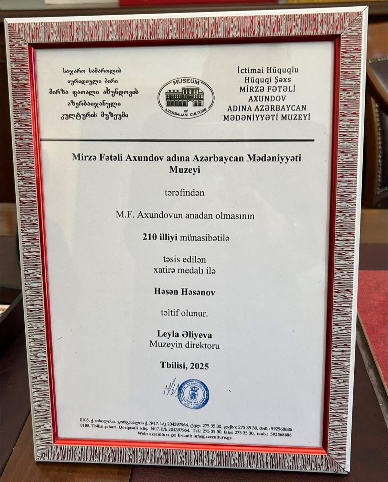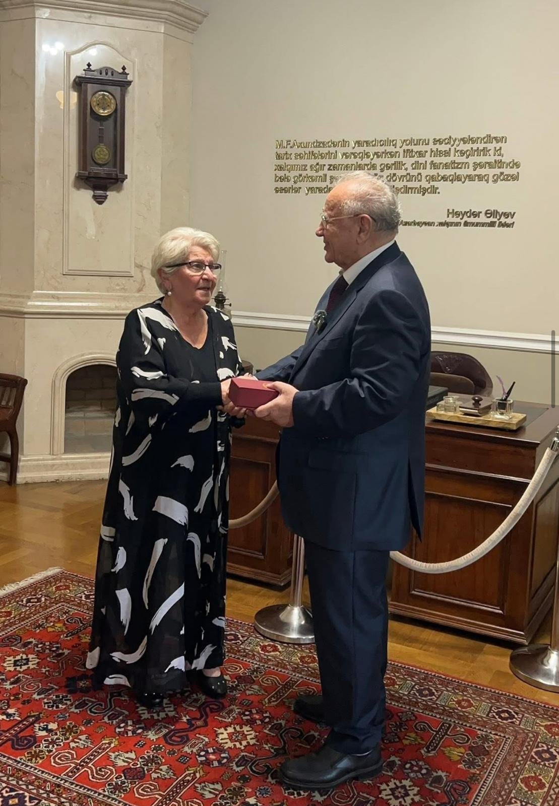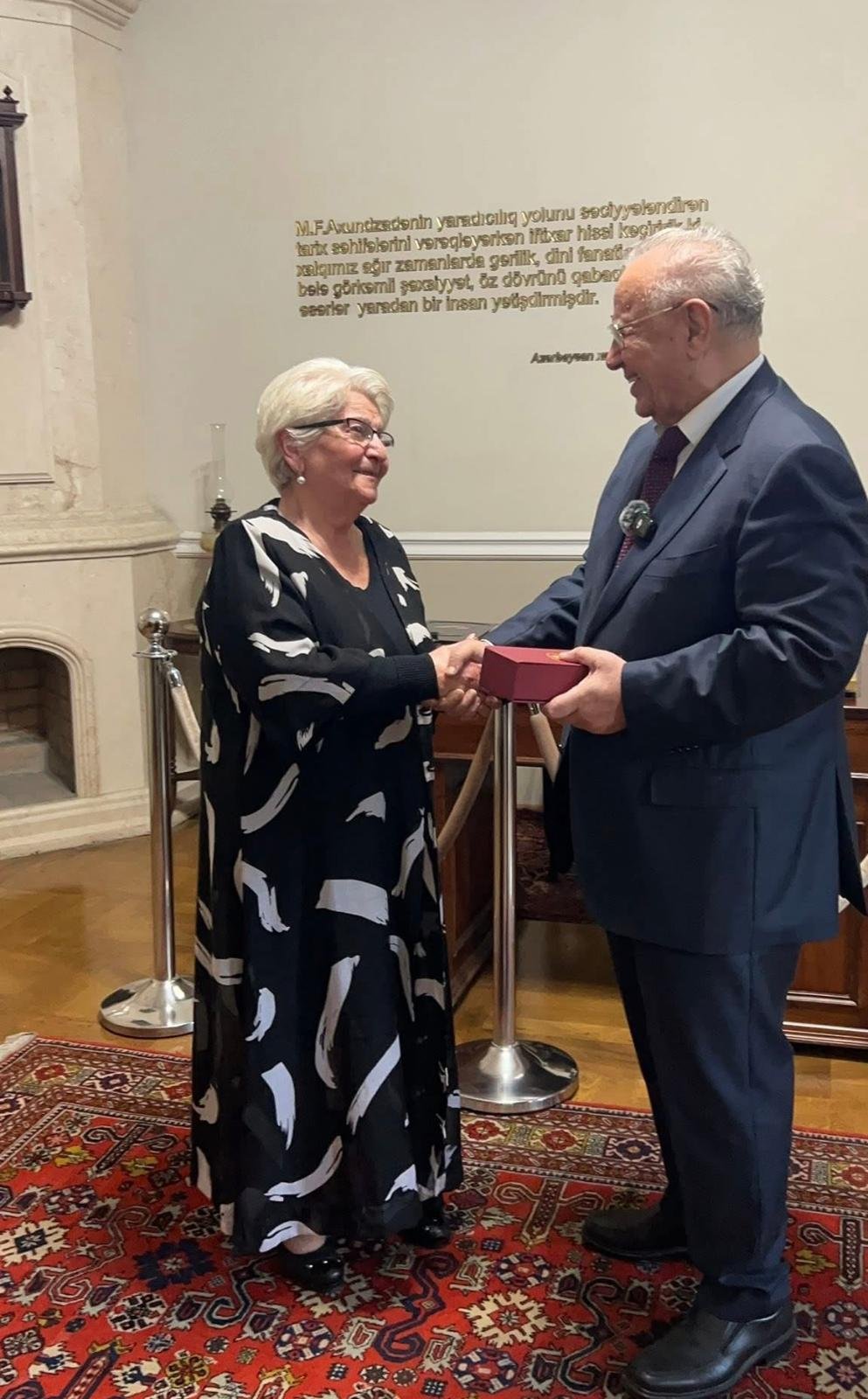 Görüş sonunda muzeyin direktoru Leyla Əliyeva Həsən Həsənova Axundovun anadan olmasının 210 illiyi münasibətilə təsis edilmiş xatirə medalını təqdim edib. Medal, görkəmli dövlət xadiminin Azərbaycan mədəniyyətinə, ədəbiyyatına və elmi irsin tanıdılmasına verdiyi töhfələrin yüksək qiymətləndirilməsi kimi dəyərləndirilib.