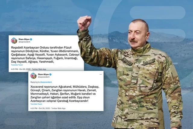 Prezident, Silahlı Qüvvələrin Ali Baş Komandanı İlham Əliyev özünün "X" səhifəsində xalqımızın torpaq itkisi kədərini azadlıq sevinci ilə əvəzləyən xəbəri verir. Ölkə başçısı ardıcıl paylaşımlar edərək dörd rayonun kəndlərinin, eləcə də Zəngilan şəhərinin işğaldan azad olunduğunun müjdəsini bir daha xalqla bölüşür: