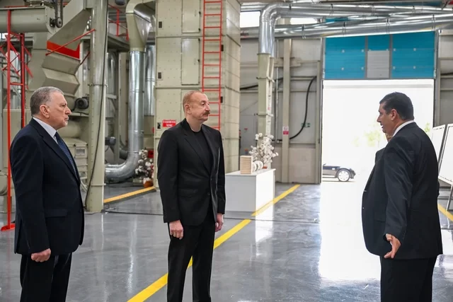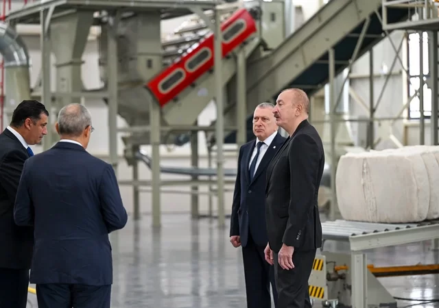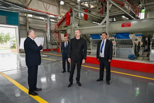 Azərbaycan Respublikasının Prezidenti İlham Əliyev oktyabrın 28-də Sabirabad Sənaye Məhəlləsində "Taşobası" Məhdud Məsuliyyətli Cəmiyyətinin (MMC) pambıq emalı zavodunun fəaliyyəti ilə tanış olub.