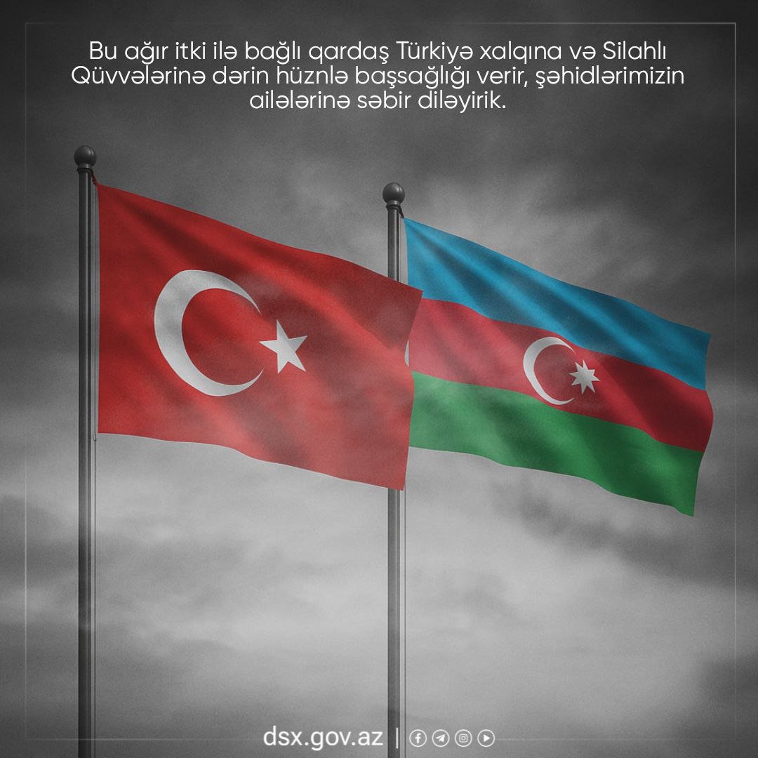 "Bu ağır itki ilə bağlı qardaş Türkiyə xalqına və Silahlı Qüvvələrinə dərin hüznlə başsağlığı verir, şəhidlərimizin ailələrinə səbir diləyirik. Azərbaycan və Türkiyə xalqları bir millət, iki dövlət olaraq hər zaman olduğu kimi bu ağır gündə də bir-birinin yanındadır.