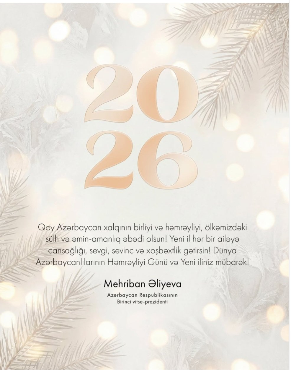 Azərbaycanın Birinci vitse-prezidenti Mehriban Əliyeva sosial şəbəkə hesablarında 31 Dekabr - Dünya Azərbaycanlılarının Həmrəyliyi Günü və Yeni il münasibətilə paylaşım edib.