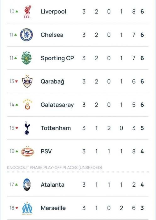 Xatırladaq ki, ÇL-in Liqa mərhələsində ilk 8 yeri tutan komanda birbaşa 1/8 finala, 9-24-cü yeri tutanlar isə pley-off mərhələsinə vəsiqə qazanır. 25-36-cı yeri tutanlar avrokuboklarda çıxışlarını başa vururlar.