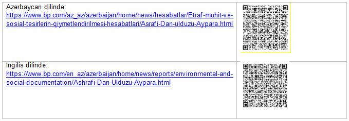 ƏMTQ sənədinin və qeyri-texniki xülasənin layihə variantları bütöv olaraq Azərbaycan və ingilis dillərində hazırlanıb və aşağıdakı keçid və ya QR kodu vasitəsilə bp-nin veb-səhifəsindən əldə edilə bilər: