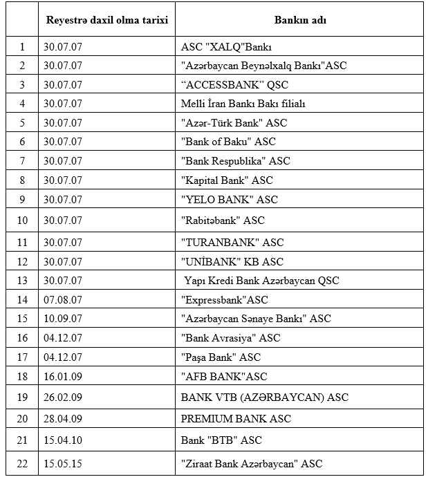 Əmanətlərin Sığortalanması Fondu “Əmanətlərin sığortalanması haqqında” Qanunun 30.1-ci maddəsinə əsasən iştirakçı bankların 28 yanvar 2026-cı il tarixinə olan reyestri açıqlayıb.