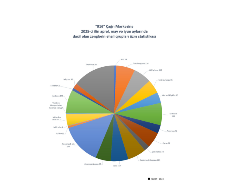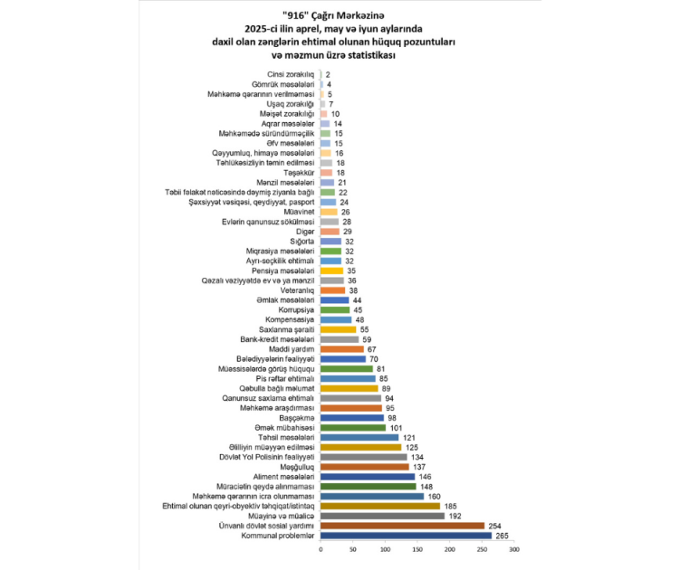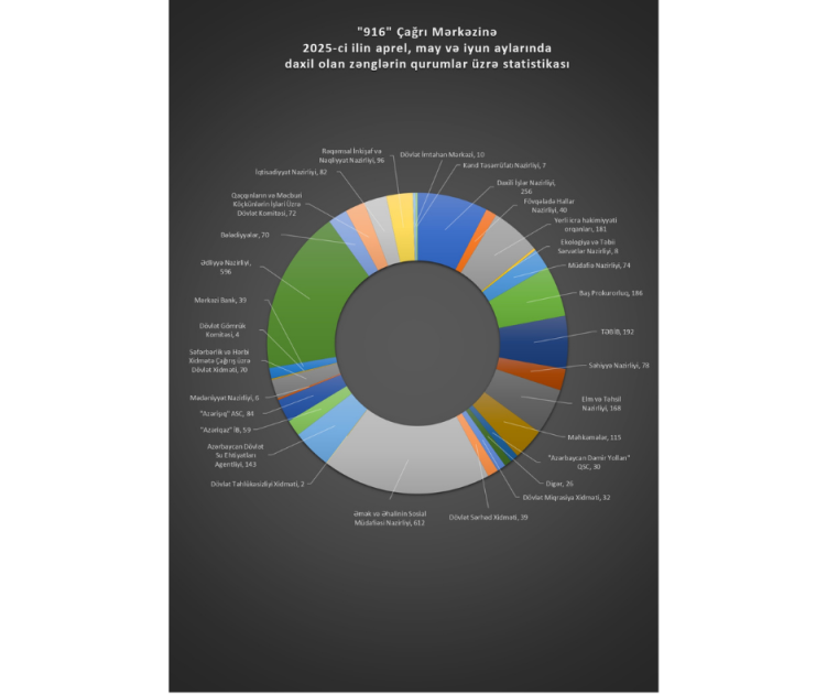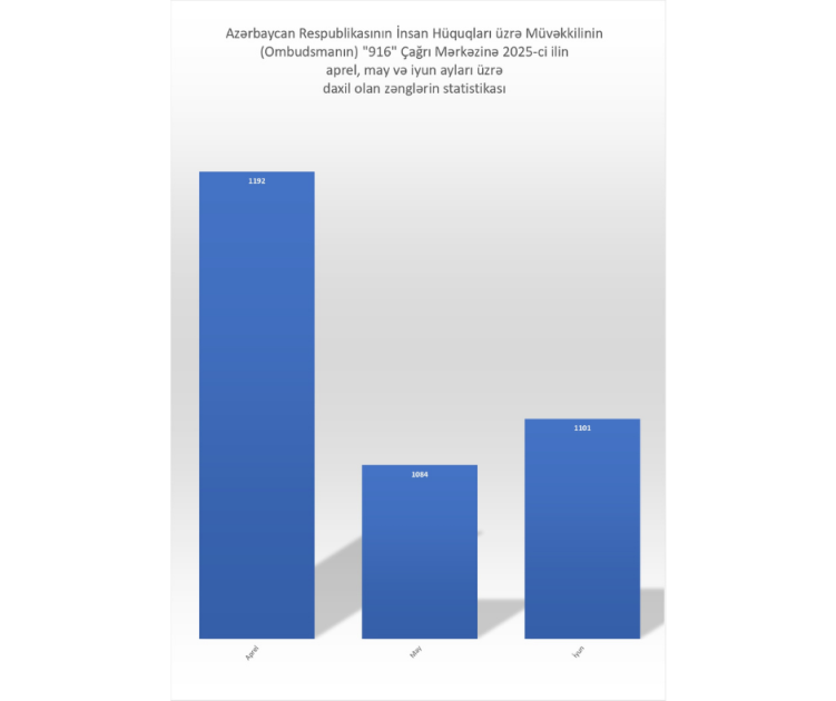 Azərbaycan Respublikasının insan hüquqları üzrə müvəkkilinin (ombudsmanın) “916” Çağrı Mərkəzinə 2025-ci ilin aprel, may və iyun ayları ərzində ümumilikdə 3377 zəng daxil olub.