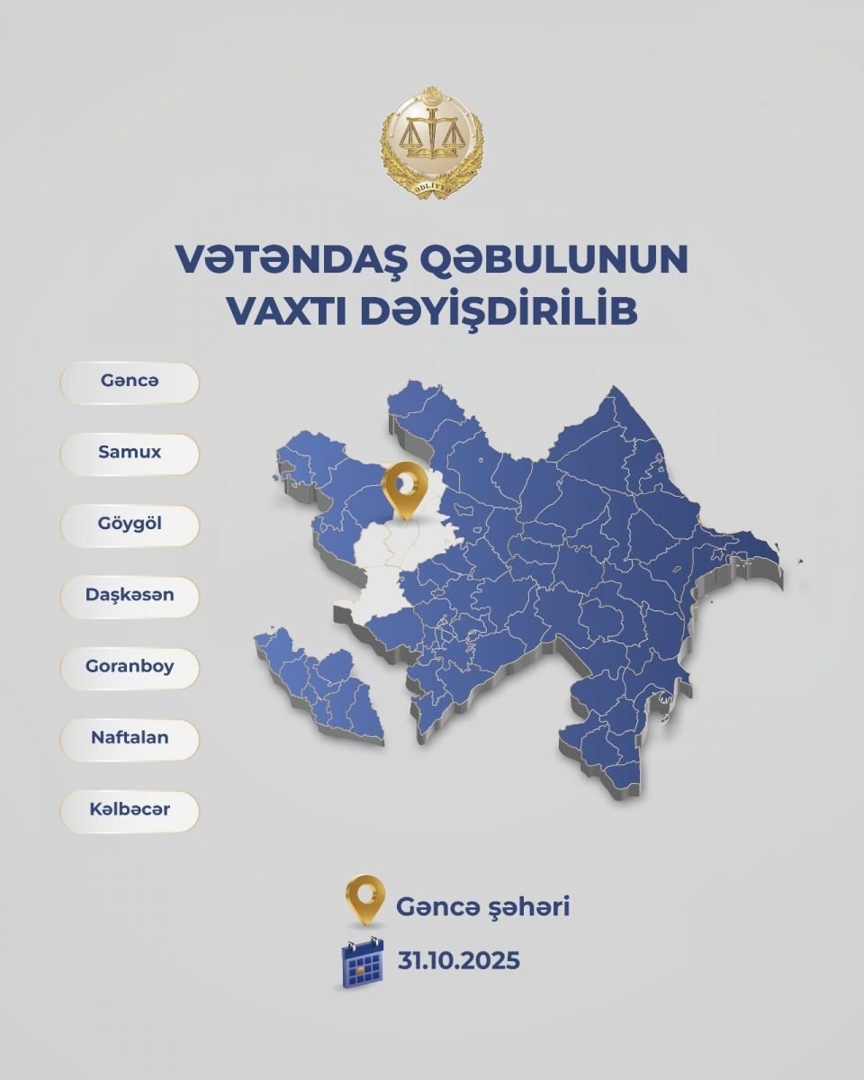 Ədliyyə naziri Fərid Əhmədovun oktyabrın 24-ü Gəncə şəhərində keçirilməsi nəzərdə tutulan vətəndaş qəbulunun vaxtı dəyişdirilib.